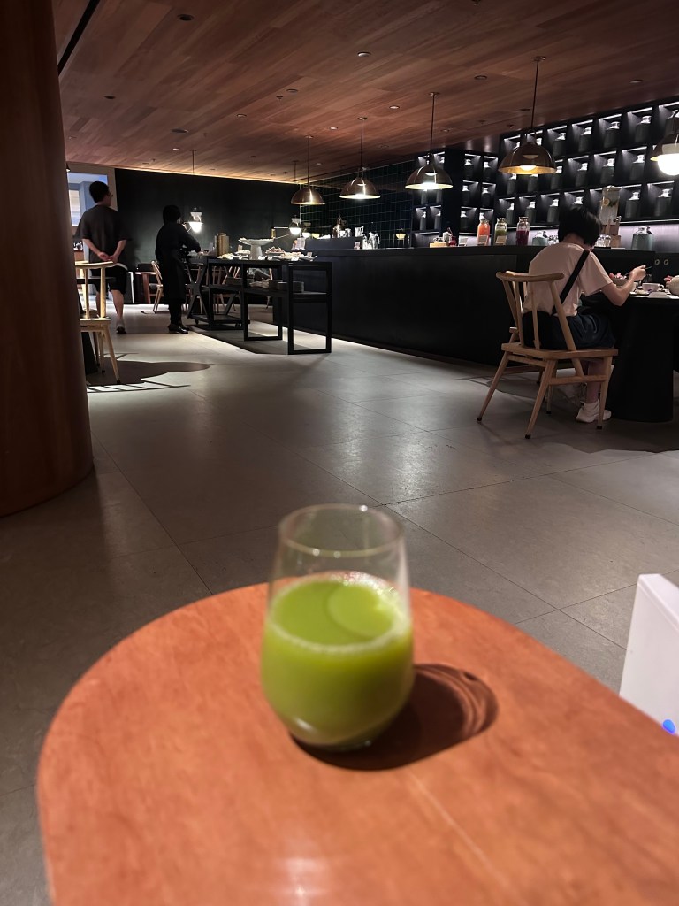 But the real gem for me was the tea room, a serene oasis that felt like a step into a traditional teahouse with a modern twist. The back wall was lined with an impressive grid of glass jars, each filled with different teas—likely a mix of green, black, oolong, and herbal varieties, illuminated softly to highlight their contents. A bartender (or should I say tea master?) was on hand, expertly pouring and serving. In front of the counter, a long black table displayed an assortment of complementary snacks, artfully arranged to tempt any passerby. I opted for the green juice to detox from all the eating I did after my Asia trip.