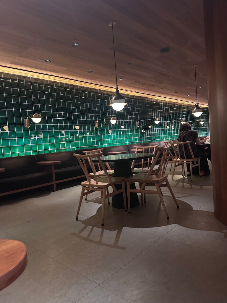 Stepping into The Pier felt like entering a high-end spa crossed with a gourmet retreat. The lounge spans a vast area, cleverly segmented to offer variety without feeling overwhelming. Dim, warm lighting from pendant lamps creates an intimate, calming atmosphere, perfect for unwinding after a flight. The decor is modern and minimalist, with dark wood tones, green tiled walls, and sleek black furniture that exudes sophistication. Everything was spotlessly clean, from the floors to the fixtures, which is a huge plus in a high-traffic airport environment.