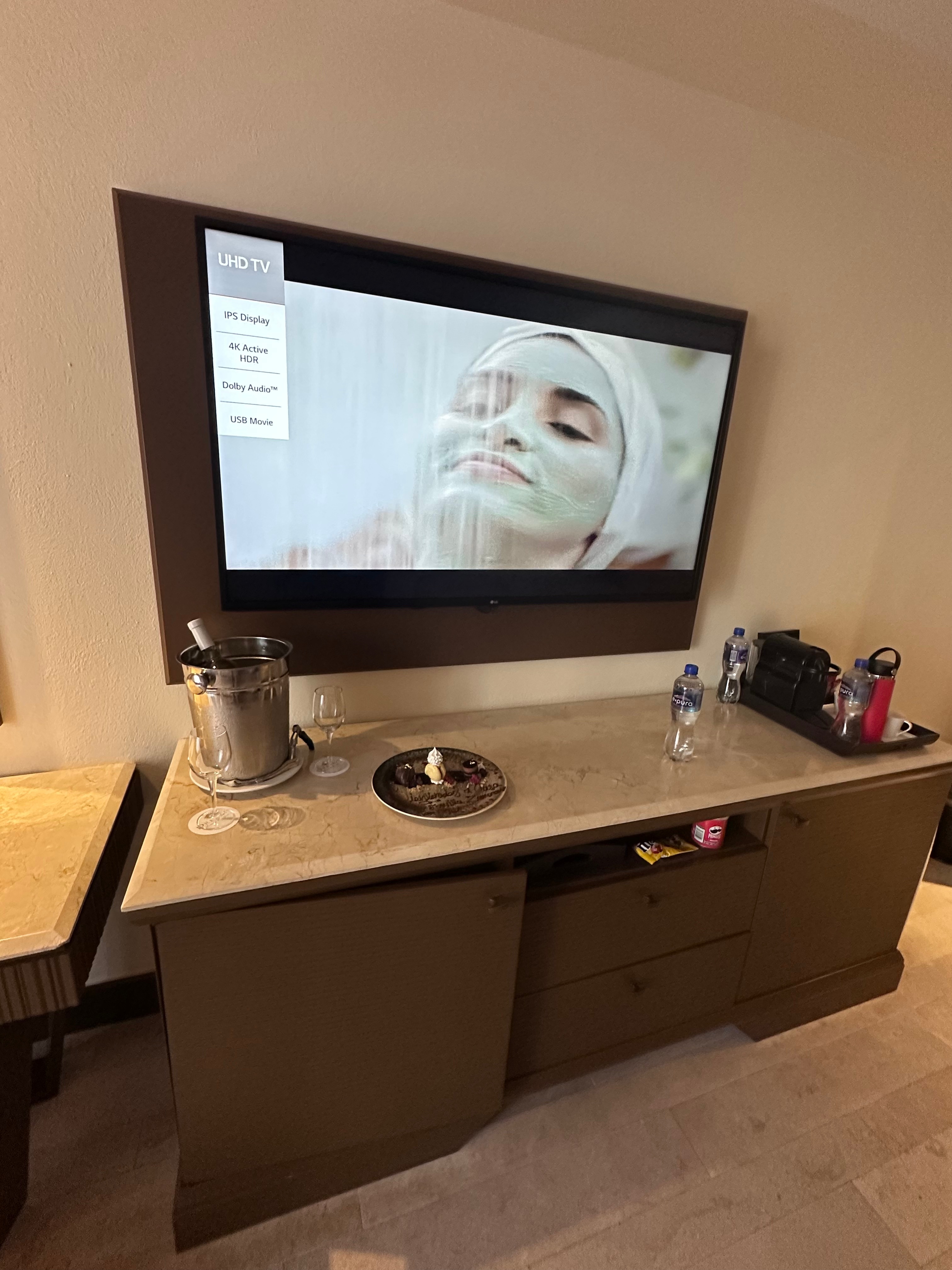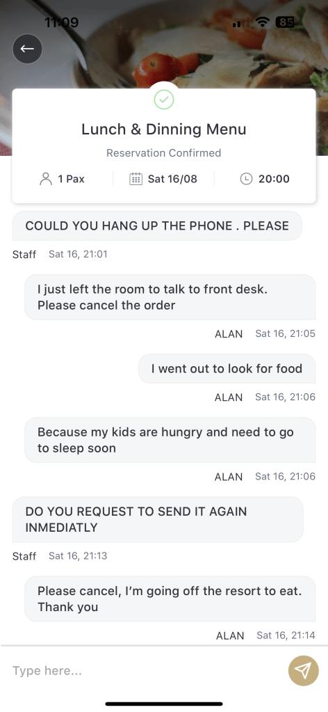 Room service via the app was a disaster—we ordered at 6:45 PM for 8:00 PM delivery, but after delays and rude all-caps responses blaming our “do not disturb” sign (which wasn’t on), we gave up at 9:05 PM and ate off-resort.