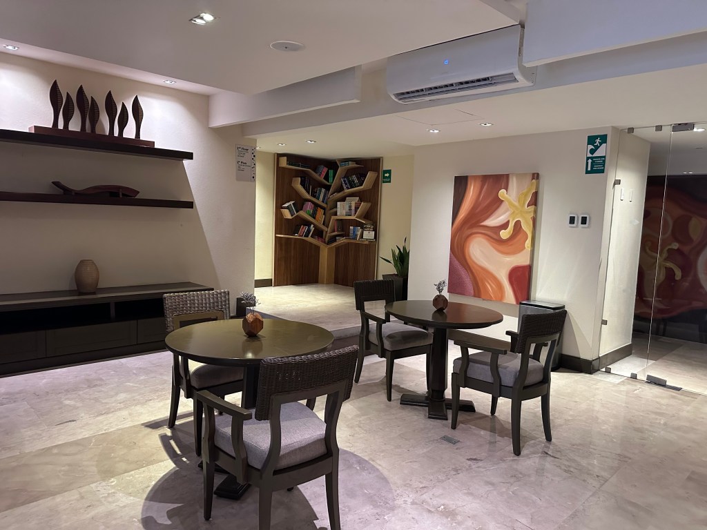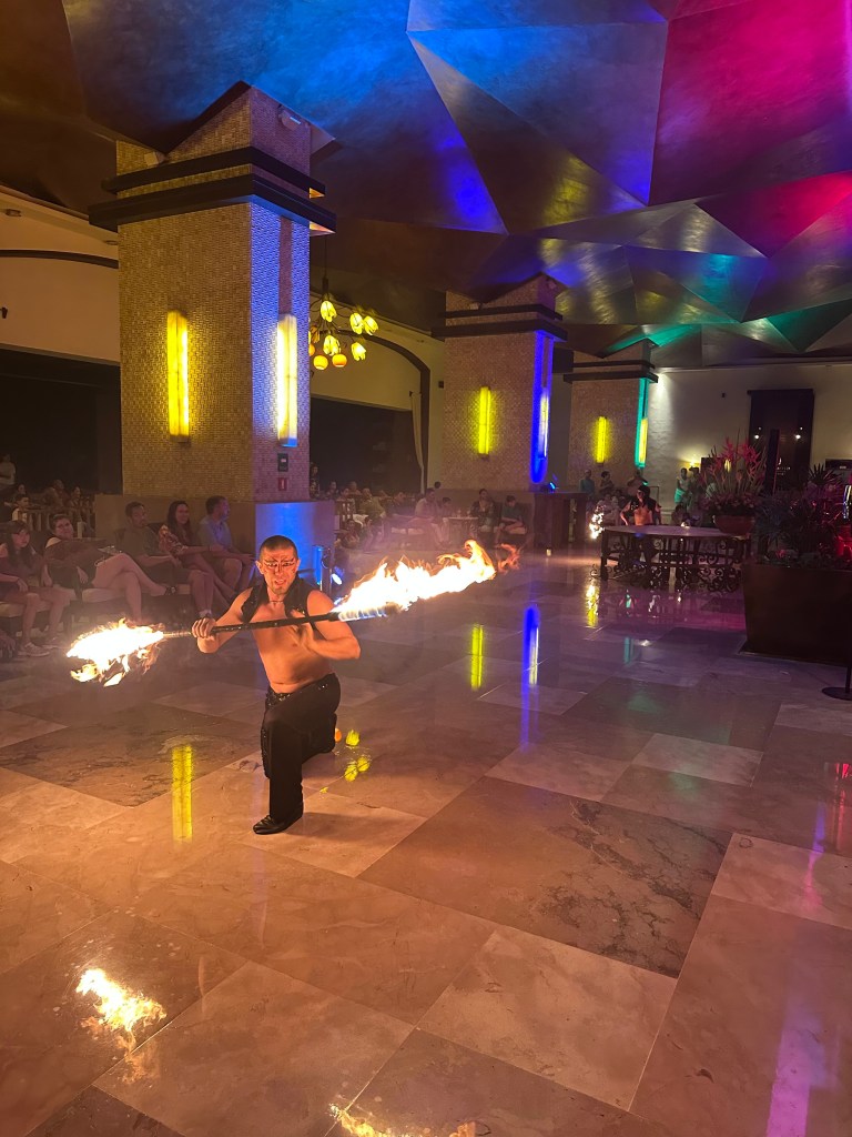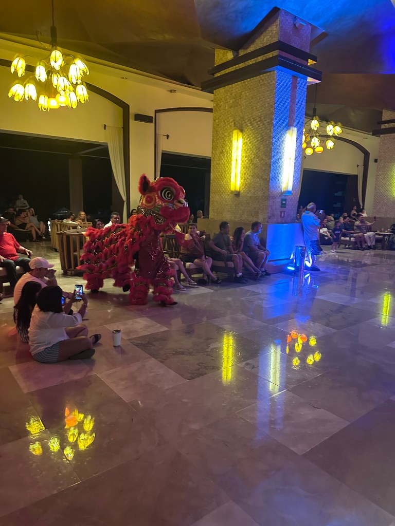 Recent reviews echo these sentiments: while some praise the clean pools and friendly staff, others note dirty areas, moldy smells in rooms, and underwhelming food compared to nearby resorts like Dreams Bahia Mita or Hyatt Ziva. Activities included a paint-and-sip session (we painted a whale at sunset with cocktails provided), kayaking and paddleboarding (book early—spots fill by 9:45 AM), and the Explorer’s Club kids’ zone with free babysitting, a play structure, trampoline, and movie area. Evening entertainment featured acrobatics and Chinese lion dancing in the lobby.