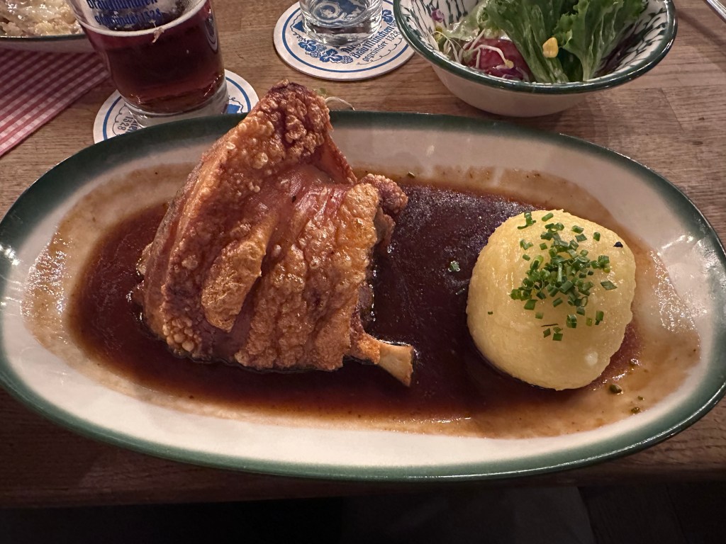 Evening dinner at Augustiner-Keller beer garden: Reservations essential as it was packed. We feasted on hearty pork knuckles (€18), sausages, and massive 1-liter beers (€15 each) – the kids had apple juice in mini steins and played in the outdoor area.