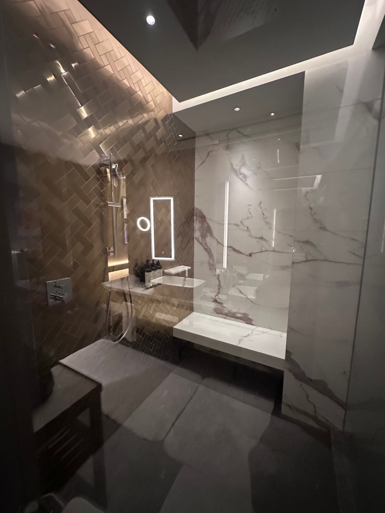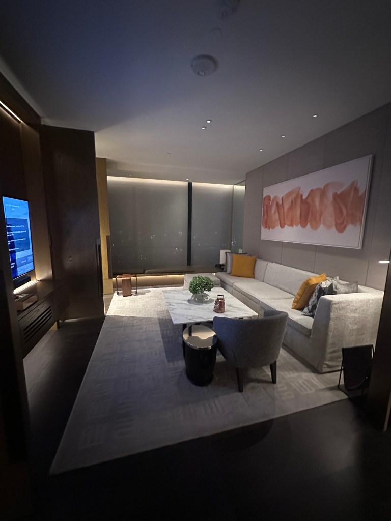 After a smooth flight into Kuala Lumpur International Airport (KLIA), we grabbed a taxi (about 45-60 minutes to the city center) and checked into our upgraded suite at the Park Hyatt. The hotel’s location in the historic Presint Merdeka 118 area made it easy to access nearby attractions. Our suite was massive—around 1,000 square feet—with floor-to-ceiling windows on two sides offering panoramic views of the city skyline and a distant cemetery (a quirky, serene contrast to the urban buzz). Luxurious touches included Toto bidet toilets, Claybrook marble sinks, and a designer standalone bathtub perfect for unwinding. As a nice surprise, the staff prepared birthday snacks and a custom cake for my wife’s special day, adding a personal touch.