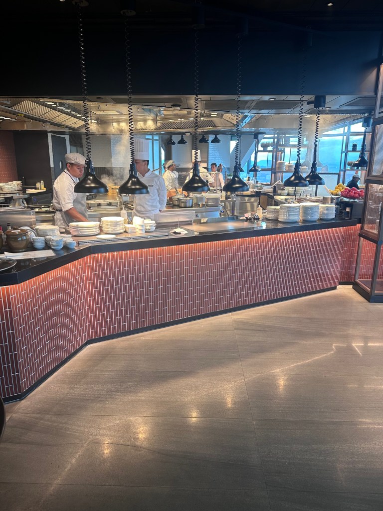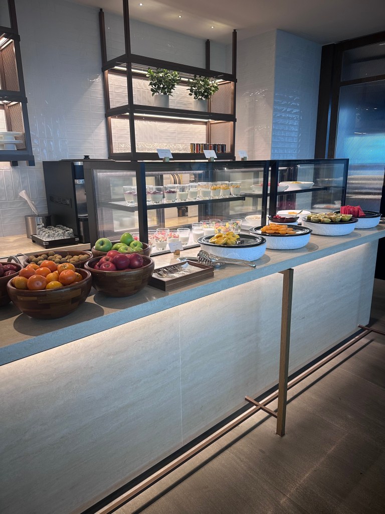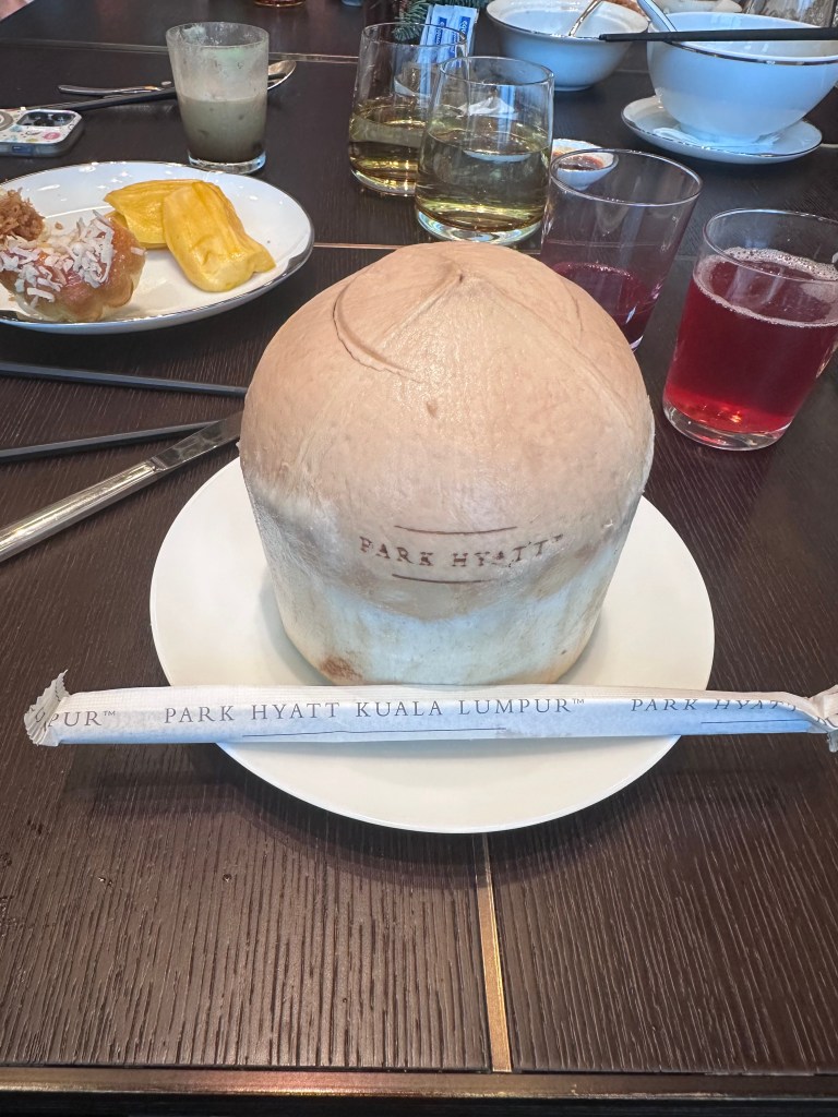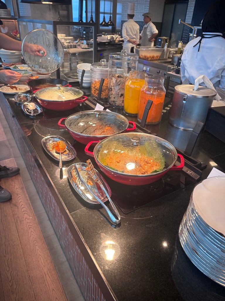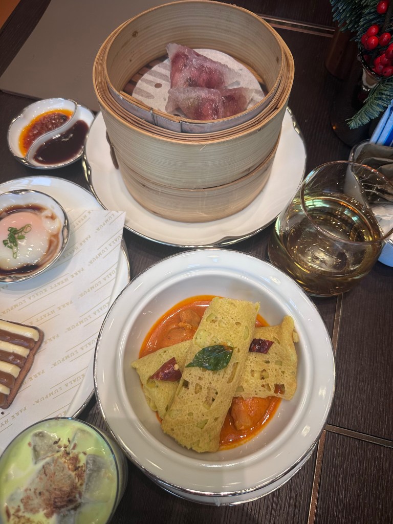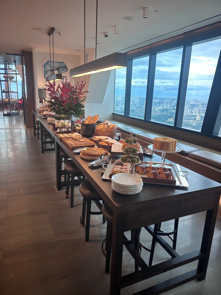 We started with breakfast at the hotel’s Park Lounge on Level 75, where the a la carte menu featured a variety of Asian-inspired dishes like congee, dim sum, and nasi lemak (coconut rice with sambal). The buffet section was limited but high-quality, with fresh fruits, pastries, and unique drinks like kombucha and coconut water (all included for Globalist members or around RM100-150 per person otherwise). The lounge’s elegant design and city views made it a relaxing family start.